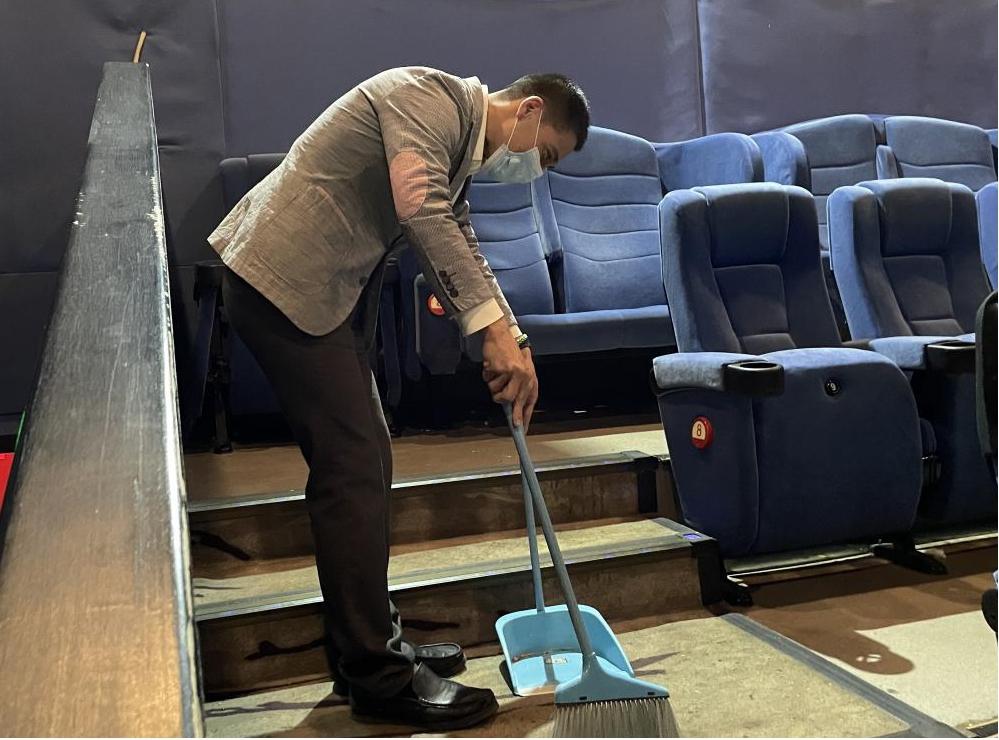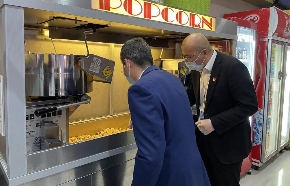 集團(tuán)黨委委員、副總經(jīng)理、機(jī)關(guān)黨委書記孫超和一支部的成員一道,通過為顧客制作爆米花和飲品、對影廳進(jìn)行消毒和衛(wèi)生清理,體驗了影城經(jīng)營一線的日常服務(wù)項目。