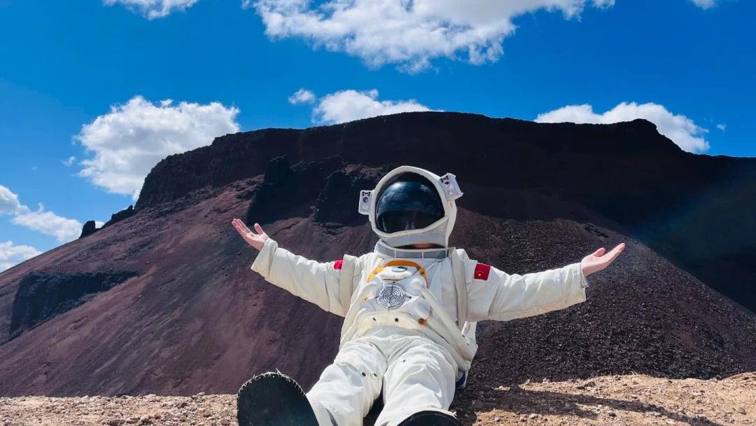 在8號火山腳下的草原緩坡低頭尋覓,運氣好能邂逅瑪瑙碎塊?;鹕缴仙⒉贾抡婵铸埬P?。站在霸王龍投下的陰影里,拍一張“侏羅紀畢業(yè)紀念”。火山熔巖堵塞河道形成的堰塞湖,碧水倒映著火山錐影。沿湖散步,原本畢業(yè)季分別的悲傷,也被稀釋了許多。6號火山(南煉丹爐)是必打卡之地,這里有獨特的黑色玄武巖地表,寸草不生,宛如月球表面。穿上純白的宇航服,手持五星紅旗,站在灰黑色的火山巖上,隨手一拍就是科幻感十足的“火星大片”。難怪網(wǎng)友笑稱:“地上的宇航員比天上的還多!”