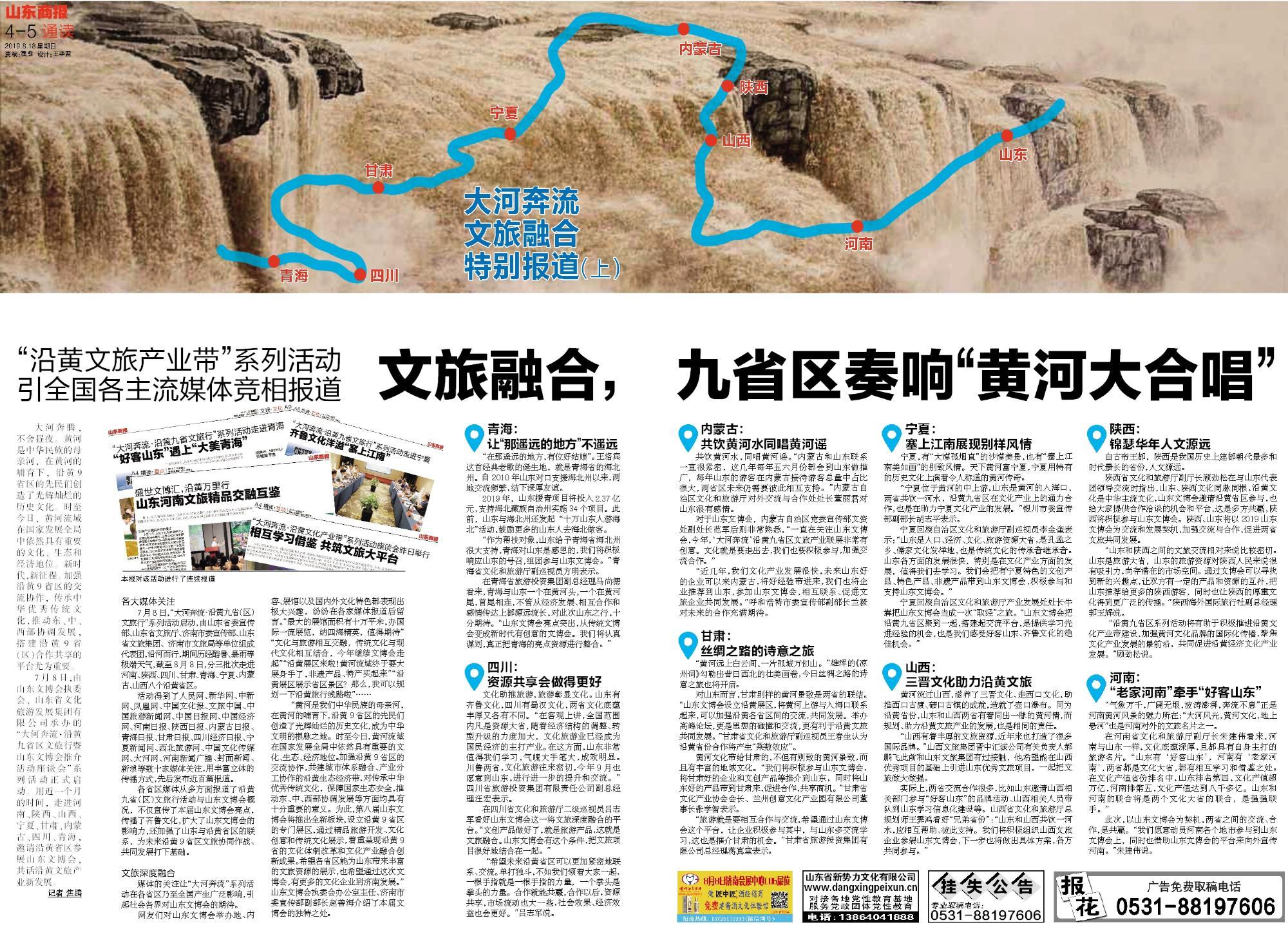 系列報(bào)道中,山東商報(bào)又陸續(xù)推出《山東陜西共襄盛世文博》《沿黃文化產(chǎn)業(yè)帶走進(jìn)四川》《山東甘肅攜手共推沿黃文旅發(fā)展》《當(dāng)“好客山東”遇上“大美青?!薄返戎仡^稿件,對(duì)在每一省區(qū)的交流合作和文旅推介活動(dòng)進(jìn)行詳實(shí)報(bào)道和生動(dòng)呈現(xiàn)。整個(gè)行程結(jié)束后,又對(duì)活動(dòng)進(jìn)行了深度總結(jié),于8月18日在報(bào)紙頭版和內(nèi)版刊出《九省區(qū)共奏黃河大合唱》,對(duì)山東文博會(huì)即將呈現(xiàn)的 “大演繹”“大身手”“大平臺(tái)”進(jìn)行層次清晰的展望;次日,則從《平臺(tái)聚力 共筑沿黃命運(yùn)共同體》《文博搭臺(tái) 盡展九曲黃河大風(fēng)采》兩個(gè)角度,分析活動(dòng)對(duì)于黃河沿岸各省區(qū)文旅融合的空前意義。