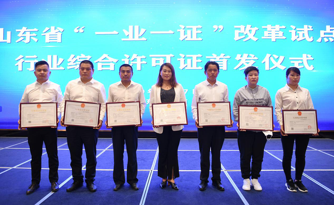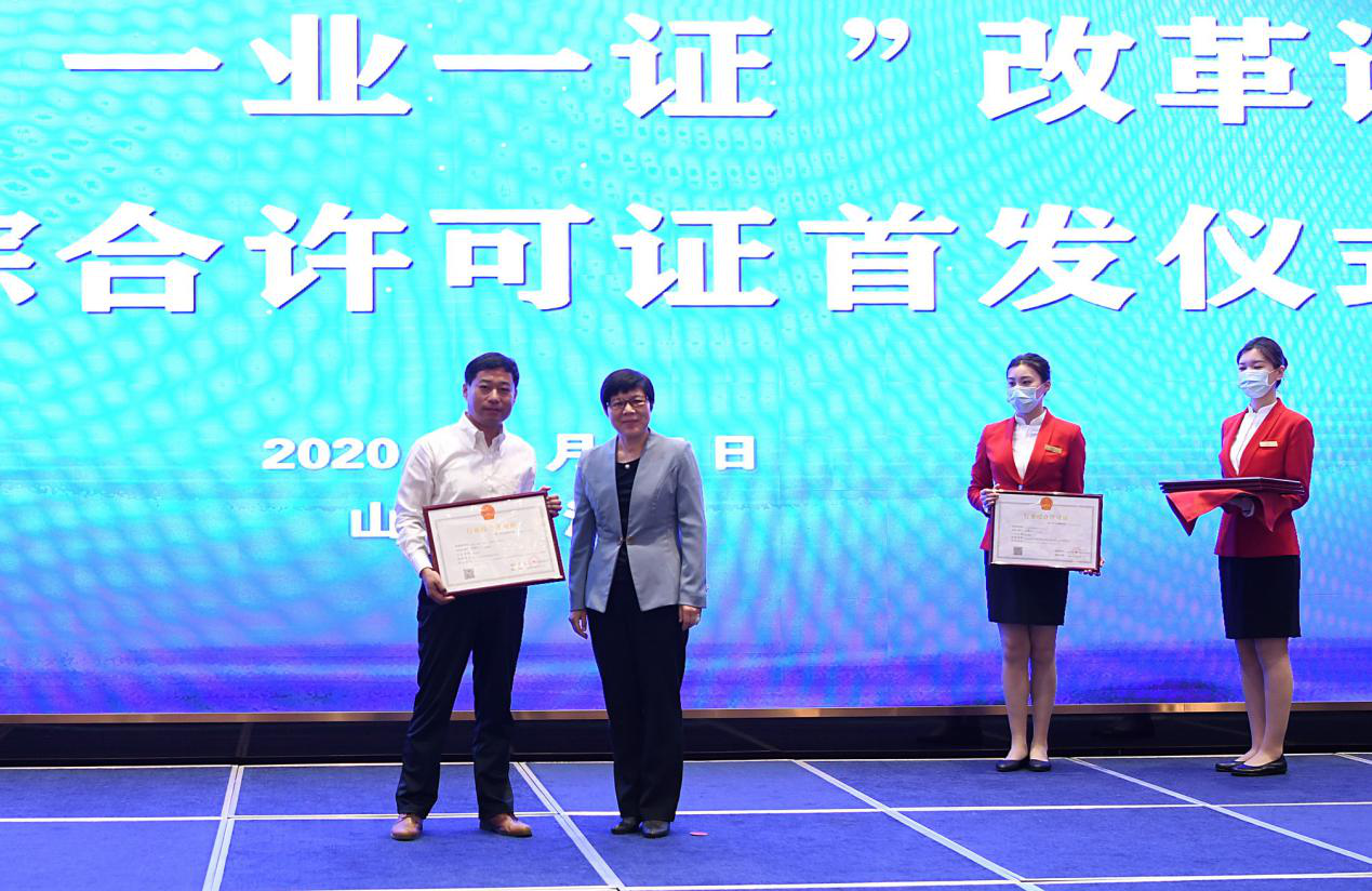 5月27日,山東省“一業(yè)一證”改革試點(diǎn)行業(yè)綜合許可證首證頒發(fā)儀式在濟(jì)南舉行。山東省副省長(zhǎng)任愛(ài)榮向20個(gè)行業(yè)頒發(fā)了行業(yè)綜合許可證,魯商九女峰(泰安)鄉(xiāng)村振興有限公司總經(jīng)理于在武第一個(gè)上臺(tái)領(lǐng)取許可證。山東首次頒發(fā)行政綜合許可證標(biāo)志著我省“一業(yè)一證”改革邁出了重要的一步,將最大限度減材料、簡(jiǎn)環(huán)節(jié)、壓時(shí)限,讓企業(yè)群眾少跑腿、不跑腿,是我省深化商事制度改革,破解“準(zhǔn)入不準(zhǔn)營(yíng)”難題,實(shí)現(xiàn)“一窗受理·一次辦好”的重大改革舉措。山東省委常委劉強(qiáng)出席儀式并致辭。