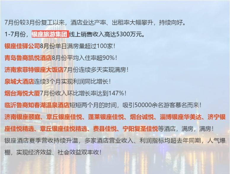 在考驗中奮起,在困局中謀篇。在省商業(yè)集團黨委的領導下,銀座旅游集團改革創(chuàng)新,深挖消費需求,創(chuàng)新營銷模式,加大協(xié)同力度,不斷培育新的利潤增長點。4月份以來,經(jīng)營指標呈現(xiàn)持續(xù)向好態(tài)勢。7月份,銀座旅游集團直營酒店當月利潤環(huán)比增幅達98%。全員助力促發(fā)展,截至目前新簽酒店22家,新開酒店24家,跟進項目20余個。