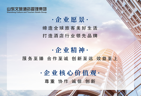 未來,山東文旅酒店管理集團(tuán)將秉持“尊重、協(xié)作、誠(chéng)信、創(chuàng)新”的企業(yè)核心價(jià)值觀,發(fā)揚(yáng)“服務(wù)至臻、合作至誠(chéng)、創(chuàng)新至遠(yuǎn)、效益至上”的企業(yè)精神,緊緊圍繞酒店主業(yè),走輕資產(chǎn)、資本化、品牌化、合作化、科技化發(fā)展道路,服務(wù)山東大局,服務(wù)人民大眾,積極研究市場(chǎng)與消費(fèi)趨勢(shì),貼近新時(shí)代消費(fèi)者訴求,打造個(gè)性突出、特色明顯的大住宿業(yè)態(tài),彰顯智慧、精品、生態(tài)、開放的格局,用滿意加驚喜的產(chǎn)品和服務(wù),努力讓每一位消費(fèi)者在山東文旅酒店遇見美好,奮力打造符合大眾消費(fèi)時(shí)代的山東一流、全國(guó)知名的現(xiàn)代化酒店管理集團(tuán)。