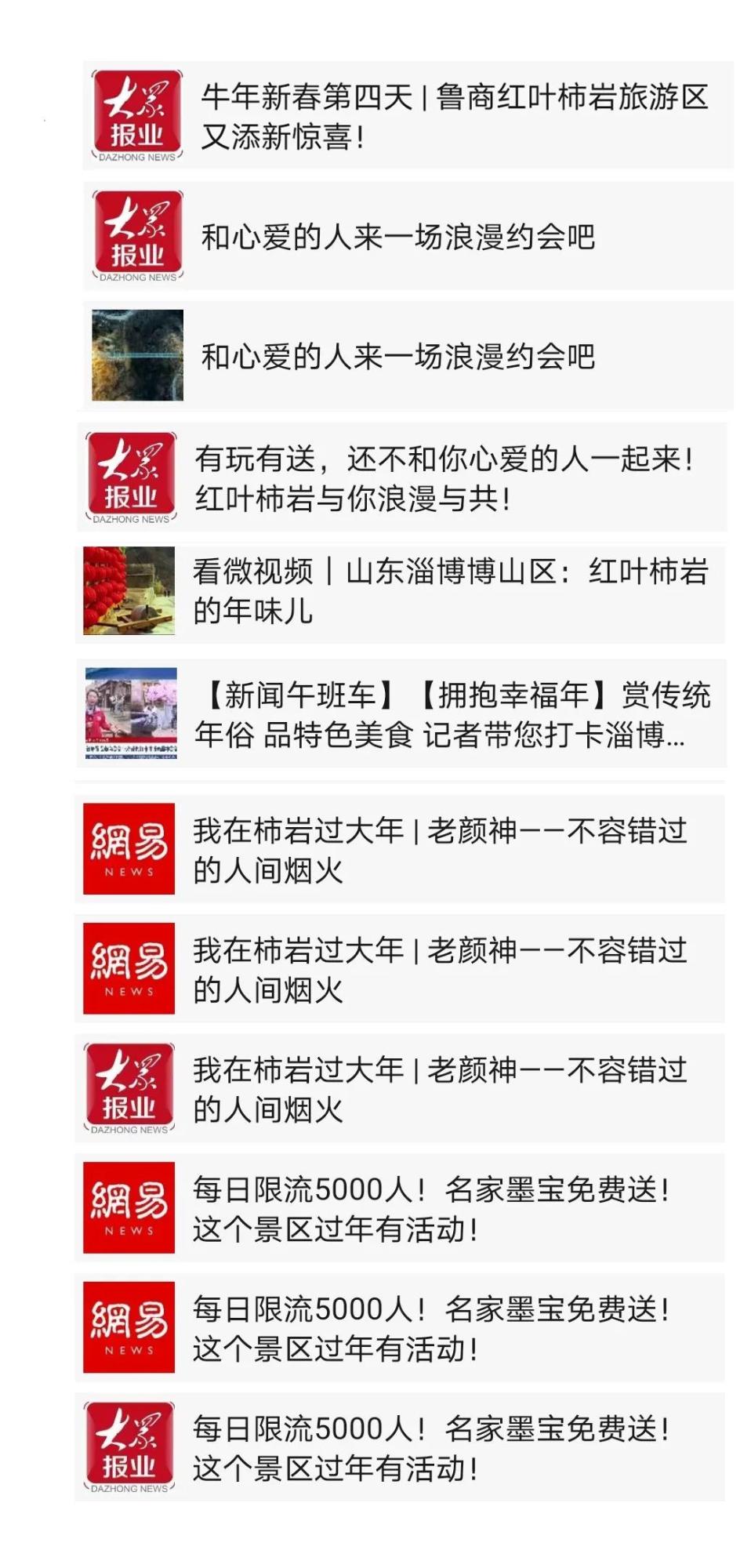 為滿足游客旅游休閑需求,山東文旅景區(qū)集團積極推廣景區(qū)文化活動,各景區(qū)通過微信平臺及抖音號每天推送旅游信息及視頻,引導游客前往游覽。其中,紅葉柿巖景區(qū)假期抖音話題瀏覽量累計幾千萬次,并榮登淄博市同類景區(qū)游客接待量第一名,成為淄博市春節(jié)假期休閑旅游的熱門景點。