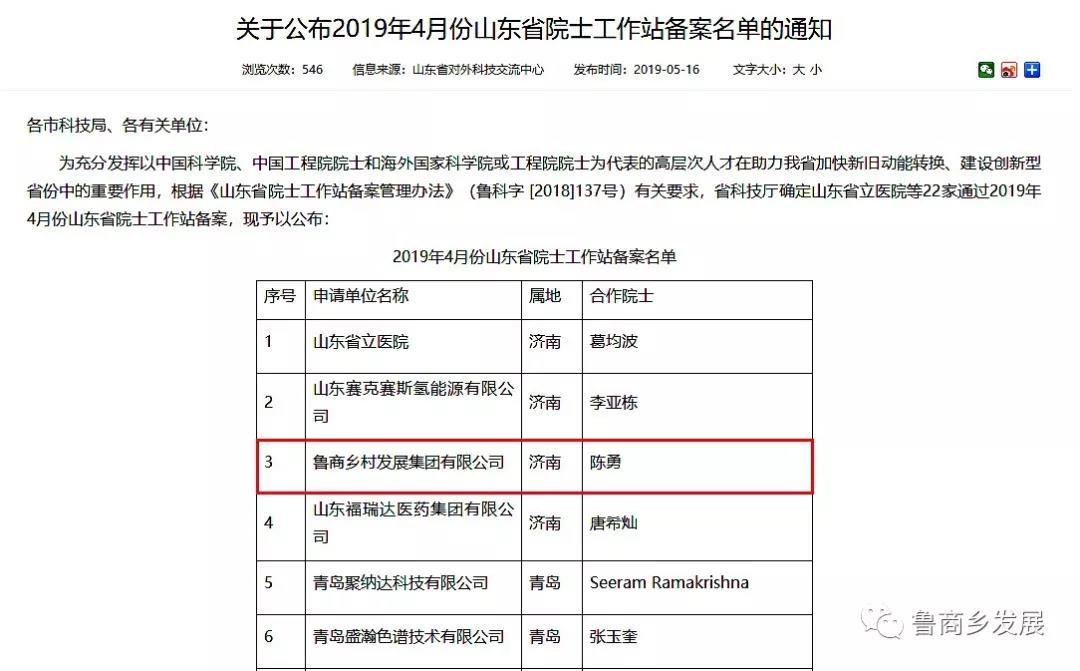 5月16日,省科技廳公布了2019年4月份山東省院士工作站備案名單,魯商鄉(xiāng)村發(fā)展集團(tuán)有限公司(以下簡稱“公司”)申請備案的“鄉(xiāng)村振興”院士工作站位列其中,成為公司首個省級院士工作站。
