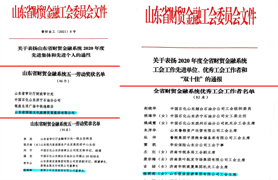 3月31日,山東省財貿(mào)金融工會一屆三次委員會議在濟南召開,國欣文旅在表彰中榮獲“山東省財貿(mào)金融系統(tǒng)五一勞動獎狀”,鄉(xiāng)發(fā)展集團董事長張建峰榮獲“山東省財貿(mào)金融系統(tǒng)五一勞動獎?wù)隆保穆镁频昙瘓F工會主席張莉莉榮獲“2020年度全省財貿(mào)金融系統(tǒng)優(yōu)秀工會工作者”。