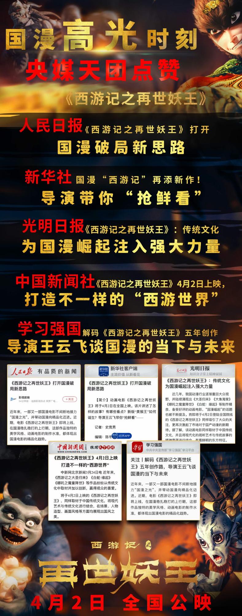 4月2日,由山東文旅投資集團(tuán)、山東省文化基金等聯(lián)合投資出品的動(dòng)漫電影《西游記之再世妖王》在全國(guó)各影院隆重上映。該影片憑借其在承接傳統(tǒng)文化基礎(chǔ)上升級(jí)打造的新穎劇情、高品質(zhì)的觀感音效,以及燃炸、溫情、歡樂(lè)的中國(guó)風(fēng)元素,吸引了各年齡段觀眾前往觀影,上映三日以來(lái)累計(jì)票房已突破6200萬(wàn)元,票房占比持續(xù)攀升,媒體、觀眾好評(píng)如潮。包括新華網(wǎng)、人民日?qǐng)?bào)、光明日?qǐng)?bào)、中國(guó)新聞社、學(xué)習(xí)強(qiáng)國(guó)在內(nèi)的多家央媒紛紛發(fā)文,點(diǎn)贊國(guó)漫崛起,對(duì)主創(chuàng)團(tuán)隊(duì)傳承創(chuàng)新傳統(tǒng)文化的匠心努力給予了充分肯定,稱影片是一部兼具中國(guó)傳統(tǒng)文化底色與視聽(tīng)語(yǔ)言創(chuàng)新、兼顧趣味性與思想深度、具有鮮明東方特征的合家歡國(guó)漫精品。