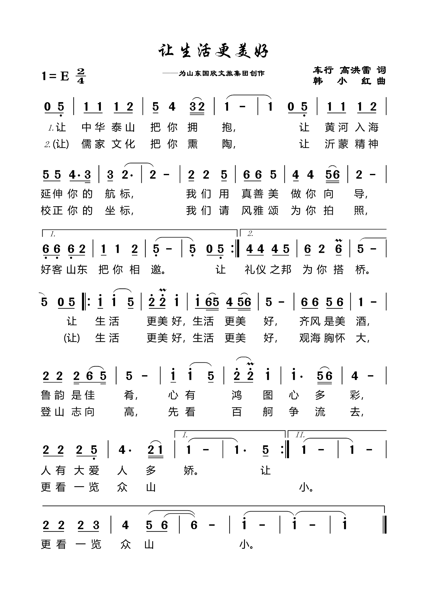 《讓生活更美好》是由國欣文旅攜手一線藝術(shù)創(chuàng)作團(tuán)隊(duì)共同打造的一首悅耳動聽的抒情歌曲,由空軍政治部文工團(tuán)創(chuàng)作室主任、中國音樂文學(xué)學(xué)會副主席車行,魯商集團(tuán)黨委書記、董事長兼國欣文旅黨委書記、董事長高洪雷作詞,青年作曲家韓小紅作曲。