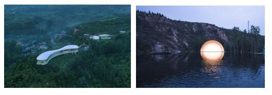 “故鄉(xiāng)的云”利用當(dāng)?shù)卮迕耖e置院落,將山林掩映、山野自然融為一體,最大程度地賦予了居住空間詩意美學(xué)。“故鄉(xiāng)的月”主體結(jié)構(gòu)與兩側(cè)峭壁巧妙結(jié)合,通過屋頂水面倒影,將屋頂天窗映成了一輪圓月,象征著四方游子對(duì)故鄉(xiāng)的獨(dú)特眷戀。