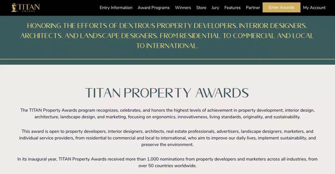 TITAN Property Awards是IAA (International Awards Associate)旗下的重量級國際獎項(xiàng),該獎項(xiàng)面向全球建筑、室內(nèi)、房地產(chǎn)開發(fā)和營銷等行業(yè)征集設(shè)計(jì)作品,旨在表彰領(lǐng)域內(nèi)的最高成就。