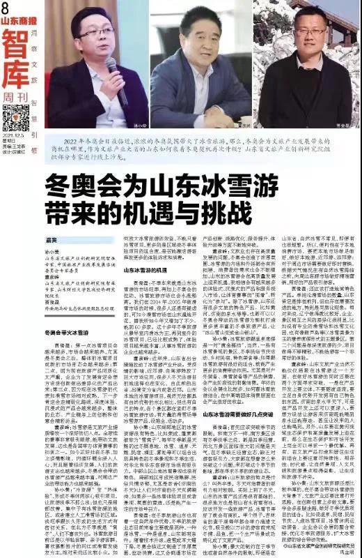 智庫版逢周日出版。首期關注了冬奧會話題和全域旅游概念。山東省文旅產業(yè)創(chuàng)新研究院智庫專家、中國旅游改革發(fā)展咨詢委員會專家委員孫小榮,山東省文旅產業(yè)創(chuàng)新研究院智庫專家、山東財經大學區(qū)域經濟研究院院長董彥嶺,濟南跑馬嶺生態(tài)休閑度假區(qū)總經理賈俊磊等各抒己見,分析了冬奧會為山東冰雪游帶來的機遇和挑戰(zhàn)。