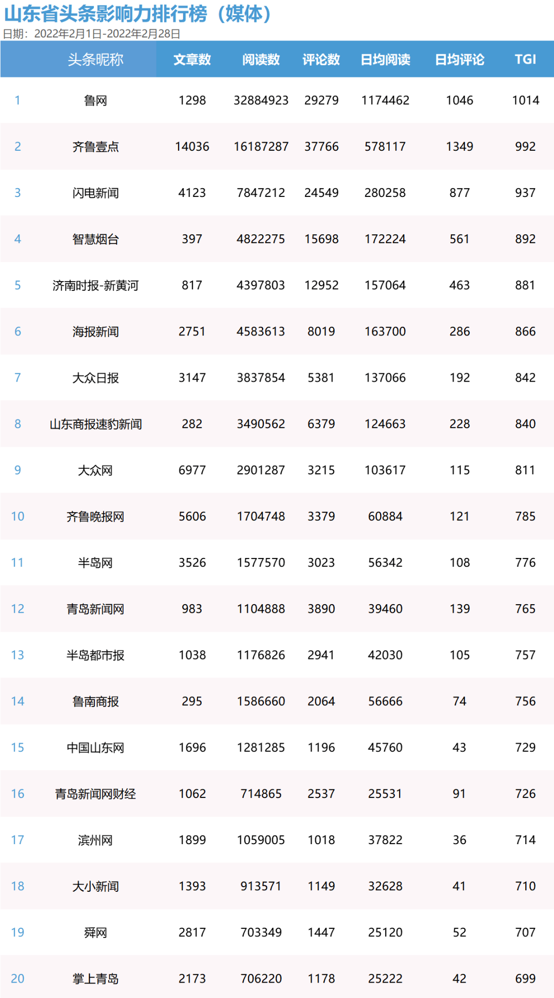 山東省頭條影響力排行榜(媒體)在2月份的數(shù)據(jù)分析中介紹,傳播效果方面,“魯網(wǎng)”閱讀數(shù)達3288萬,為第二名賬號閱讀數(shù)的兩倍,以1014的TGI值位列第一,成為榜單中唯一TGI值突破1000的賬號。