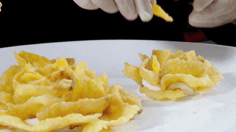 “既有花的模樣,又有肉的鮮香,顏值與口味兼具并非易事?!睘榱酥谱鬟@道菜品,酒店大廚張輝可謂是絞盡腦汁,反復(fù)去牡丹園觀賞牡丹的形狀、花相;同時(shí)去市場(chǎng)挑選黑魚(yú),用炸好的魚(yú)片制作成牡丹花瓣,魚(yú)片太厚達(dá)不到效果,太薄則易碎,張輝一次次在毫厘之間尋找著微妙的臨界點(diǎn)。經(jīng)過(guò)反復(fù)試驗(yàn),張輝最終將每一片魚(yú)切成0.3毫米,經(jīng)過(guò)熱油烹炸后,既保持了花瓣的形狀,又保留了酥脆的口感。張輝為這道黑魚(yú)做成的菜,取名金牡丹。