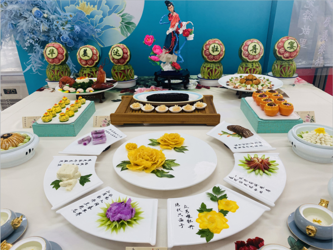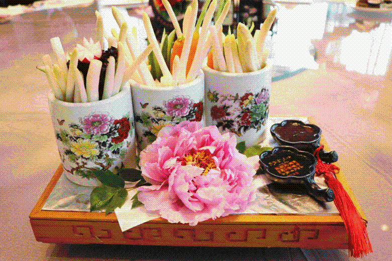 張輝還設(shè)計(jì)了一系列以牡丹為主題的熱菜、涼菜、湯羹,“富貴花開(kāi)糖醋魚(yú)”“滿(mǎn)園春色貴妃浴”……這套由六道涼菜、十二道熱菜、一面食、一甜品組成的帶有牡丹元素的特色文化宴席,美不勝收。