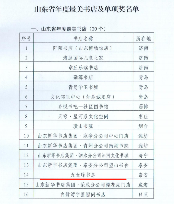 5月11日,中共山東省委宣傳部公示了2022年度山東省年度最美書店及單項獎名單,九女峰書房獲評山東省年度最美書店。