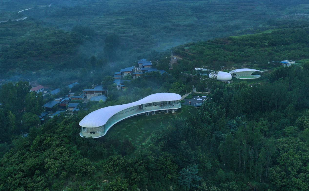九女峰書房位于泰山·九女峰鄉(xiāng)村振興示范區(qū)故鄉(xiāng)的云民宿區(qū)域至高處,獨特的建筑動線與起伏岑寂的山脈相呼應,像一朵云彩延綿無盡,有一種靜止的流暢感。
