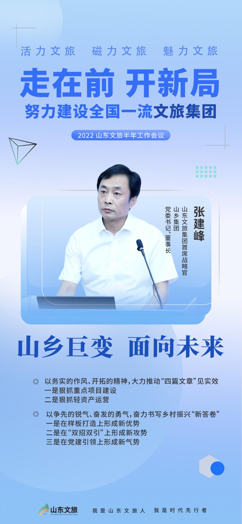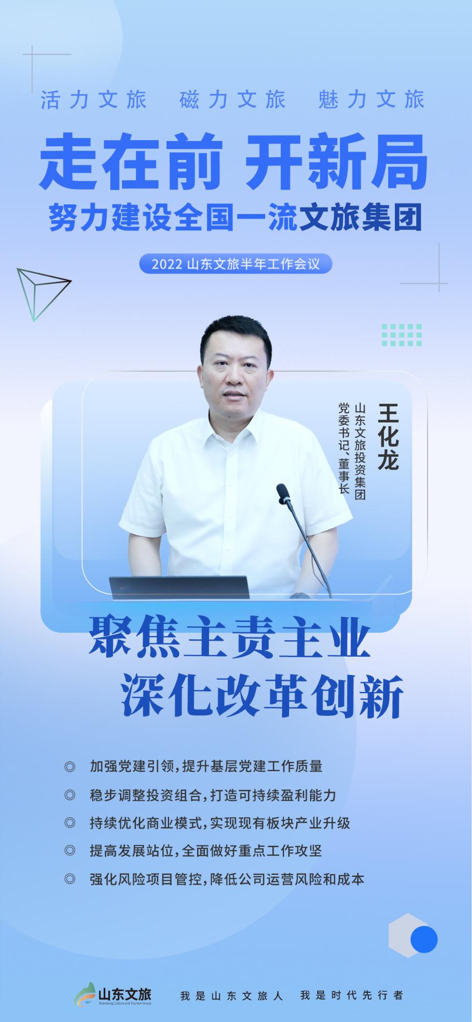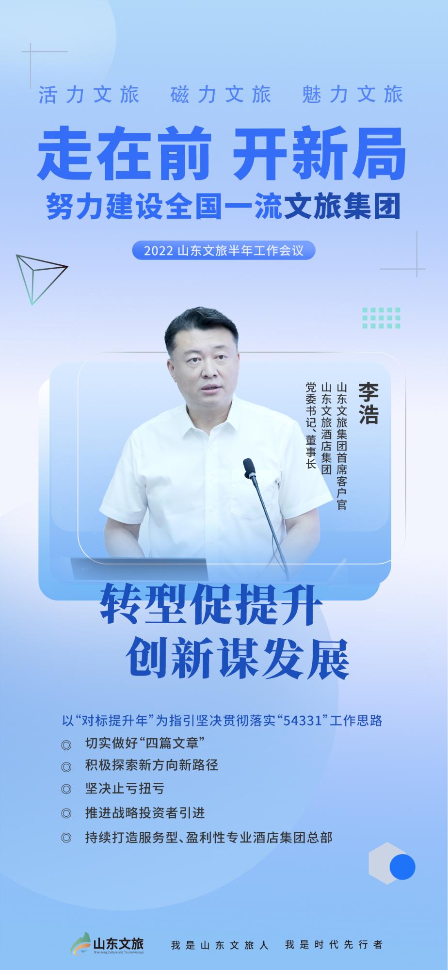 在山東文旅半年經(jīng)濟(jì)工作分析會(huì)上,集團(tuán)黨委書(shū)記、董事長(zhǎng)高洪雷對(duì)集團(tuán)2022年下半年工作進(jìn)行重點(diǎn)部署,要深入學(xué)習(xí)貫徹黨的二十大精神,堅(jiān)持以習(xí)近平總書(shū)記“三個(gè)走在前”的重要指示為根本遵循,以建設(shè)現(xiàn)代化經(jīng)濟(jì)文化強(qiáng)省為己任,以“對(duì)標(biāo)提升年”為抓手,按照“54331”的工作思路,實(shí)施平臺(tái)化、智能化、精品化、生態(tài)化、國(guó)際化“五大戰(zhàn)略”,做好鄉(xiāng)村振興、黃河戰(zhàn)略、海洋強(qiáng)省、山東手造“四篇文章”,實(shí)現(xiàn)由塊到鏈、由投資到投智、由競(jìng)爭(zhēng)到協(xié)同“三個(gè)轉(zhuǎn)變”,形成活力文旅、磁力文旅、魅力文旅“三力文旅”,全力打造具有“世界眼光、國(guó)際標(biāo)準(zhǔn)、全國(guó)一流、山東特色”的文旅集團(tuán)。