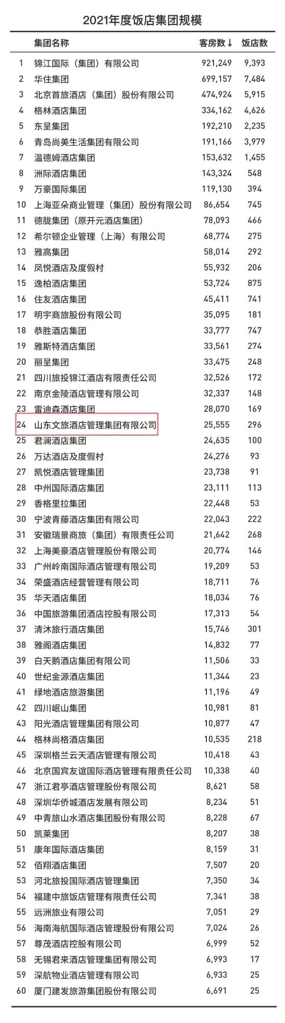 由中國旅游飯店業(yè)協(xié)會主辦,攜程集團(tuán)、北京眾薈信息技術(shù)股份有限公司協(xié)辦的“2021年度中國飯店集團(tuán)60強(qiáng)”新聞發(fā)布會于12月29日在北京舉行。中國旅游飯店業(yè)協(xié)會會長李峰宣布了“2021年度中國飯店集團(tuán)60強(qiáng)”名單。山東文旅集團(tuán)旗下山東文旅酒店集團(tuán)再度蟬聯(lián)中國飯店集團(tuán)60強(qiáng),規(guī)模位列第24位。