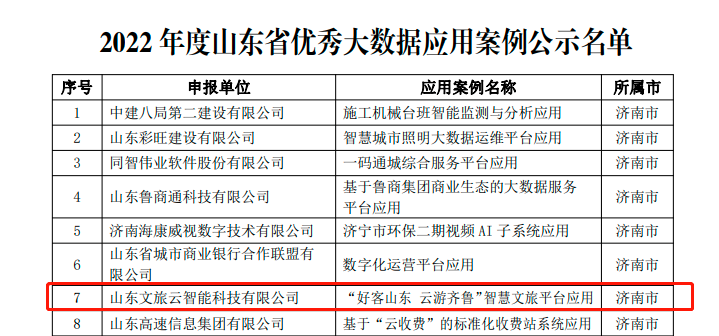 近期,山東文旅云智能科技有限公司(簡(jiǎn)稱“文旅云公司”)喜訊頻傳。由文旅云公司承建的“好客山東 云游齊魯”智慧文旅平臺(tái)入選山東省工業(yè)和信息化廳組織評(píng)選的“三優(yōu)兩重項(xiàng)目”名單(2022年度山東省優(yōu)秀大數(shù)據(jù)應(yīng)用案例),文旅云公司入選山東省工業(yè)和信息化廳組織評(píng)選的“2022年度山東省創(chuàng)新型中小企業(yè)”名單。同時(shí),文旅云公司總經(jīng)理曲磊榮獲由山東省數(shù)字經(jīng)濟(jì)協(xié)會(huì)評(píng)選的2022年度山東省大數(shù)據(jù)產(chǎn)業(yè)“領(lǐng)軍人物”。