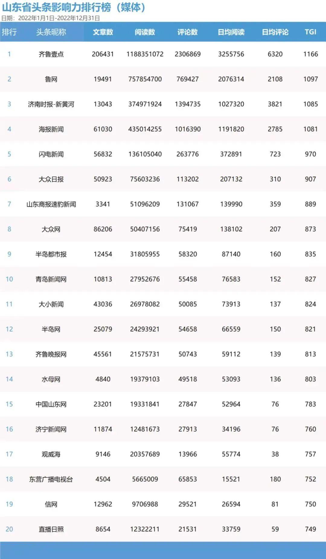 據(jù)了解,該榜單根據(jù)2022年1月1日至12月31日期間,山東省媒體賬號在今日頭條平臺上的發(fā)文數(shù)據(jù)和傳播數(shù)據(jù),綜合頭條號傳播指數(shù)(TGI)公式統(tǒng)計分析傳播影響力,并以此為依據(jù)得出該平臺最具傳播影響力的TOP20賬號。