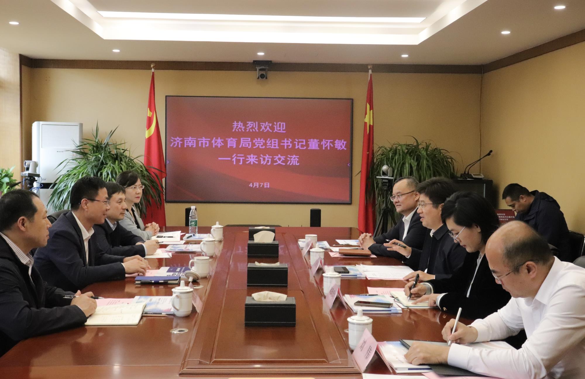 4月7日,濟南市體育局黨組書記董懷敏率隊到訪山東文旅集團,集團黨委副書記、董事、總經理門家春會見。