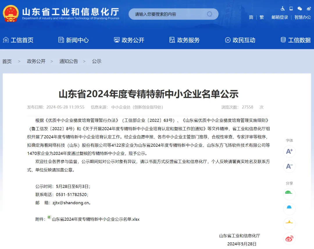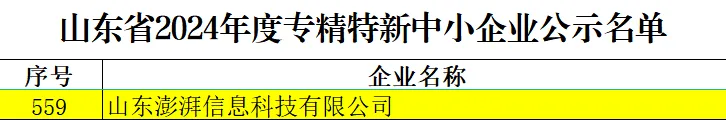 近日,山東省工業(yè)和信息化廳發(fā)布了《山東省2024年度專精特新中小企業(yè)名單公示》,山東文旅集團(tuán)科技發(fā)展有限公司權(quán)屬單位山東澎湃信息科技有限公司(簡稱“澎湃科技”)成功入選山東省2024年度專精特新中小企業(yè),這是澎湃科技繼通過高新技術(shù)企業(yè)認(rèn)定之后又一殊榮。