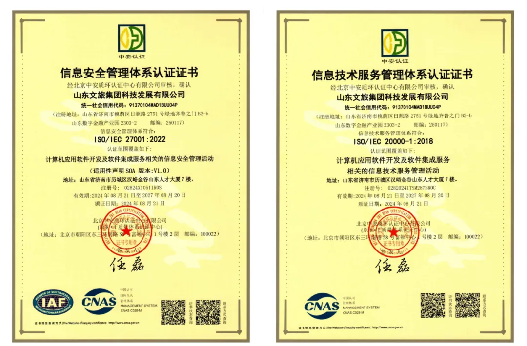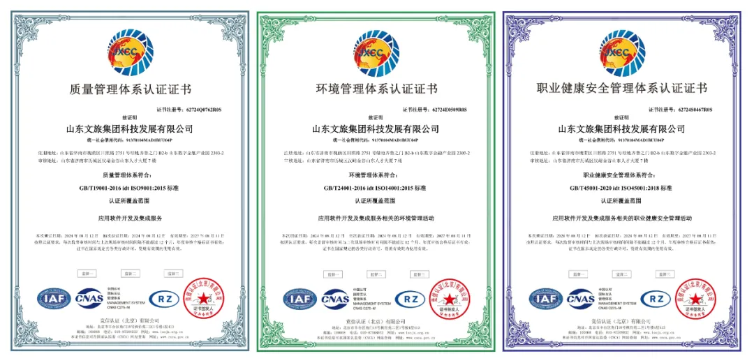 近期,為推進(jìn)業(yè)務(wù)規(guī)范化管理,提升公司市場拓展能力,文旅科技公司通過了由國際標(biāo)準(zhǔn)化組織(ISO)制定的五項(xiàng)管理體系認(rèn)證。其中包括,作為企業(yè)管理現(xiàn)代化重要標(biāo)志的ISO9001質(zhì)量管理體系、ISO14001環(huán)境管理體系、ISO45001職業(yè)健康安全管理體系等三項(xiàng)體系,以及信息軟件開發(fā)行業(yè)必備的ISO20000信息技術(shù)服務(wù)管理體系認(rèn)證、ISO27001信息安全管理體系認(rèn)證等兩項(xiàng)體系。
