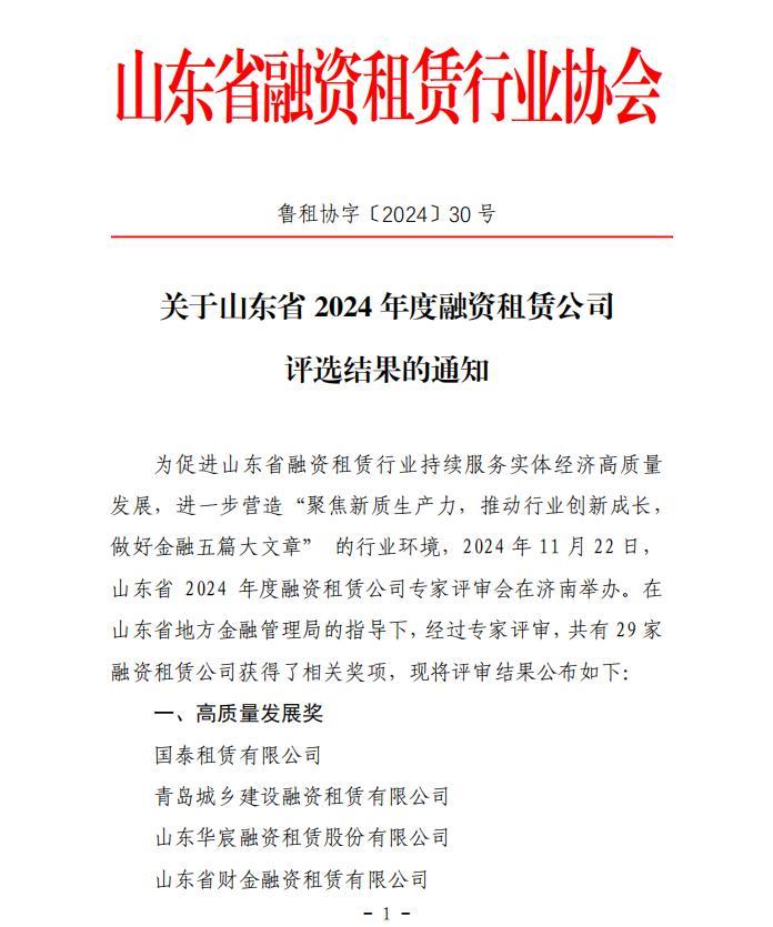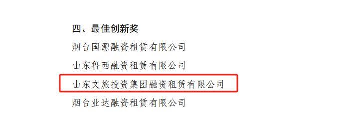 近日,山東省融資租賃行業(yè)協(xié)會舉辦了2024年全省融資租賃行業(yè)有關獎項評選活動。在省地方金融管理局的指導下,經(jīng)過專家評審,山東文旅投資集團融資租賃有限公司(以下簡稱“文旅租賃”)獲評“最佳創(chuàng)新獎”,成為全省四家獲此殊榮的公司之一。