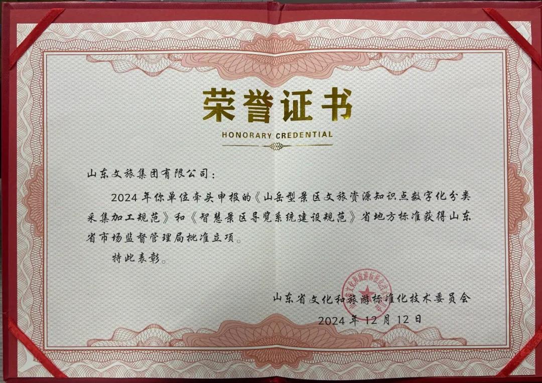 近日,在2024年山東省文化和旅游標(biāo)準(zhǔn)化技術(shù)委員會(huì)工作年會(huì)上,山東文旅集團(tuán)獲評(píng)“2024年度優(yōu)秀單位”。由集團(tuán)牽頭申報(bào)的兩項(xiàng)省地方標(biāo)準(zhǔn)獲得山東省市場(chǎng)監(jiān)督管理局批準(zhǔn)立項(xiàng),山東省文化和旅游標(biāo)準(zhǔn)化技術(shù)委員會(huì)特此進(jìn)行表彰。