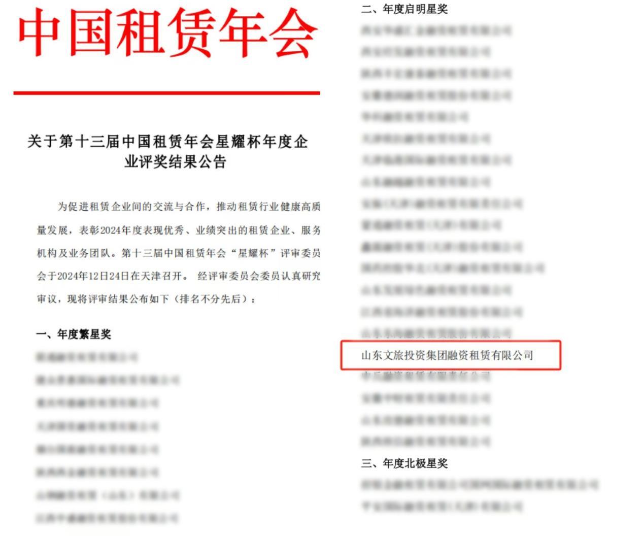 近日,中國租賃年會(huì)評(píng)審委員會(huì)發(fā)布了《關(guān)于第十三屆中國租賃年會(huì)星耀杯年度企業(yè)評(píng)獎(jiǎng)結(jié)果公告》,經(jīng)評(píng)審委員會(huì)評(píng)審,山東文旅投資集團(tuán)融資租賃有限公司(以下簡稱“文旅租賃”)獲評(píng)“年度啟明星獎(jiǎng)”。