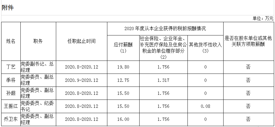 山東文旅集團負責人2020年度薪酬信息披露表